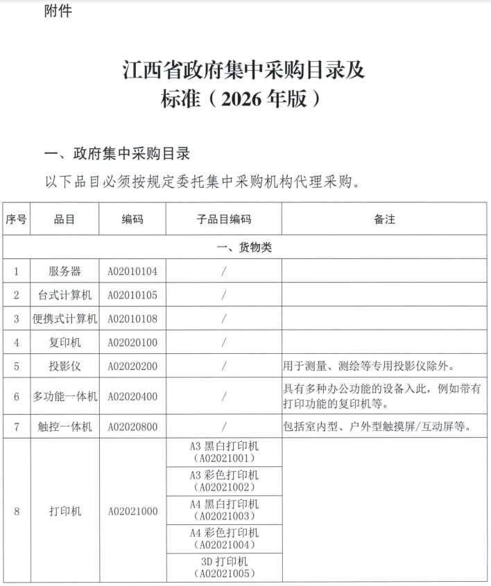 江西省政府集中采购目录及标准(2026年版)