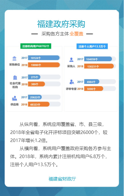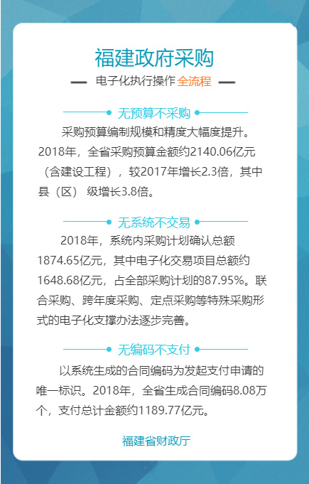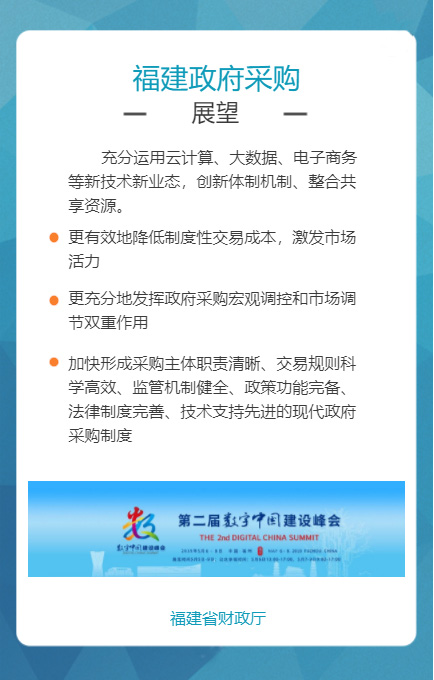 “福建省政府采购网上公开信息系统”是针对政府采购活动中存在的采购效率低、价格高、采购期长,以及各种不规范问题而组织建设的,通过充分运用云计算、大数据、电子商务等新技术新业态,创新体制机制,整合共享资源,管理创新获得国务院领导肯定。