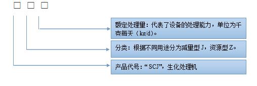 CJ/T 227-2018中,对设备名称的命名规则进行了规定,第一部分由“SCJ”构成,是生化处理机的产品代号;第二部分为“J”或“Z”,划分了设备的不同用途,前者为减量型代号,后者为资源型代号;第三部分为一串数字,显示的是设备的处理能力,单位为千克每天。