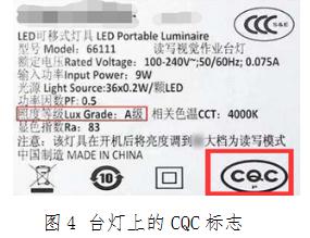 产品上如加贴有CQC标志,如图4所示,则表明该类产品通过国家第三方专业认证机构中国质量认证中心的评价,符合国家标准GB/T 9473的要求,照度等级为A级或AA级,显色指数至少80,视网膜蓝光危害为RG0级,除上述指标外,消费者关注的指标,如闪烁等级至少为GB/T 9473中的低风险,如果声称无频闪的,则符合GB/T 9473中无风险等级要求;对人体的电磁辐射符合国家标准GB/T 31275-2014《照明设备对人体电磁辐射的评价》的限值要求。照度及照度均匀度、显色指数等参数均在产品铭牌上有明示。